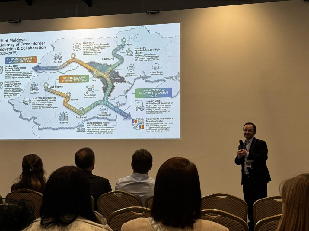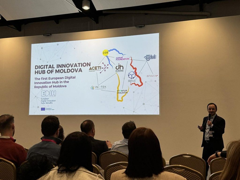 În contextul colaborării strânse cu partenerii din România, un punct important al prezenței ACETI și DIH of Moldova la eveniment a fost referința la proiectul transfrontalier xDIH – Cross Border Digital Innovation Hub, dezvoltat în parteneriat cu Universitatea Tehnică „Gheorghe Asachi” din Iași, Universitatea Tehnică a Moldovei și Digital Innovation Zone. Cofinanțat de Uniunea Europeană prin Programul Interreg NEXT România–Republica Moldova, proiectul urmărește crearea unui hub comun de inovare digitală, care va facilita accesul instituțiilor și IMM-urilor de pe ambele maluri ale Prutului la tehnologii avansate, expertiză, infrastructură și programe educaționale inovatoare, contribuind astfel la consolidarea unui ecosistem digital integrat, dedicat atât profesorilor și studenților, cât și mediului de afaceri.