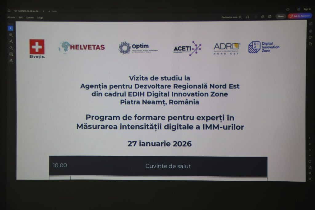 Between 26–28 January 2026, a group of graduates of the Training Programme for Experts in Measuring the Digital Intensity of SMEs, organised by ACETI within the “Digital Maturity in Innovative Regions” Project, with the support of the Government of Switzerland and Helvetas Moldova, through the OPTIM Project, took part in a study visit hosted by the North-East Regional Development Agency (ADR Nord-Est) in Piatra Neamț, Romania. The agency is a founding institution of the Digital Innovation Zone, a European-recognised European Digital Innovation Hub (EDIH).